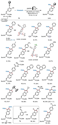 Having established optimal reaction conditions, we investigated the substrate scope of various alkyne-modified O-methyltyrosines for cyclization with diphenyl diselenides (2a) (Scheme 2). The protocol proved suitable for the use of 2-alkynyl tyrosine (1b), yielding the desired benzo[b]furan tyrosines (3) in 67% yield. The exact structures of compounds 3 (CCDC: 2314535) and 7 (CCDC: 2314534) were further confirmed by X-ray analysis. Surprisingly, the unprotected amino (4) or carboxyl groups (5) were still able to give the product without oxidation in this system. Electron-withdrawing (-F, -CF3, -Ala) and electron-donating (-OMe) groups at the para position underwent smooth conversion to afford the selenylation products (6–9) in good to excellent yields. In addition to the various electronic substituents on the aromatic ring, polycyclic aromatic (naphthalene, anthracene) and heteroaryl (thiophene, ferrocene) alkyne-substituted tyrosines were also well tolerated, resulting in cyclization products 10–13. Notably, the cyclopropane-substituted alkynyl tyrosine was selected to produce the selenium-substituted cyclization product (14) with high selectivity and near-equivalent yields, rather than the ternary ring-opening product. Furthermore, aliphatic alkynes were also compatible, leading to the corresponding selenylation tyrosines (14–16) with moderate conversions, while the trimethylsilyl groups (17) maintained good reactivity. Surprisingly, the scope of tyrosines for this protocol could be readily extended to include vinyl (18). Not only that, triphenylamine (19) are also well adapted to the reaction system in moderate yields.