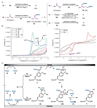 | Scheme 7. Proposed reaction mechanism. (A) Preliminary mechanism studies. (B) Cyclic voltammograms. Conditions: a glassy carbon working electrode, a Ag/AgCl (3 mol/L KCl) reference electrode, and a platinum wire counter electrode, 0.01 mol/L analyte in 0.1 mol/L nBu4NClO4 dissolved in MeCN:HFIP (4:1), 100 mV/s scan rate. (C) Possible mechanism. | |