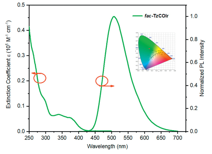 | Fig. 1. Photophysical properties of fac-TzCOIr, measured in DCM at room temperature (10−5 mol/L). | |