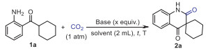 In light of the observed challenges and our previous findings, we investigated a reaction using (2-aminophenyl)(cyclohexyl)methanone 1a as the substrate under 1 atm of CO2 (Table 1). We successfully synthesized the target compound 2a with a yield of 89% using LiOtBu as the base in a mixture of dimethylformamide (DMF)/o-xylene via heating at 110 ℃ for 24 h (Table 1, entry 1) [47]. The use of NaOtBu or KOtBu decreased the yield of 2a (Table 1, entries 2 and 3). Moreover, using solvents such as DMF or o-xylene alone resulted in diminished yields of 2a (Table 1, entries 4 and 5), which might be explained by our earlier observations that the resultant product tended to disperse in the less basic o-xylene, mitigating further degradation. Alternative solvent combinations, such as DMAc/o-xylene or diglyme/o-xylene, also resulted in lower yields of 2a (Table 1, entries 6 and 7). Notably, decreasing the amount of LiOtBu from 4.0 equiv. to 3.0 equiv. considerably decreased the product yield. Building upon prior mechanistic studies [31], LiOtBu appears to fulfill multiple functions beyond simple base mediation, including (ⅰ) CO2 activation through chemical fixation and (ⅱ) direct involvement in intermediate generation. This multifunctional nature consequently renders the base stoichiometry a critical parameter for reaction optimization (Table 1, entries 8 and 9). Next, we investigated the effects of varying the reaction durations and temperatures on the product yield. Decreasing the reaction duration to 16 or 12 h resulted in a lower yield (Table 1, entries 10 and 11). However, temperature had a substantial effect: increasing the temperature markedly increased the product yields (Table 1, entries 12–16), achieving a remarkable yield of 98% when the temperature was increased to 120 ℃. Finally, both LiOtBu (Table 1, entry 17) and CO2 (Table 1, entry 18) were confirmed to be essential components facilitating the reaction’s progression.