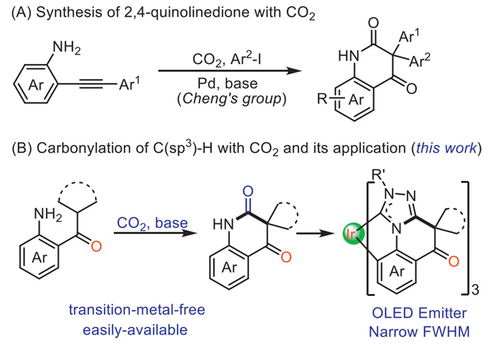 The 2,4-quinolinedione framework represents an important class of carbonyl-containing compounds in medicinal and materials chemistry [35–37]. Numerous investigators have explored synthetic methodologies for these compounds [38–40], including the notable contributions from the Cheng group (Scheme 1A) [39]. However, most of these methods suffer from complex reaction conditions or inadequate selectivity. Therefore, it is particularly important to efficiently and selectively synthesize such compounds in simple systems. Building on our persistent interest in the carbonylation of C–H bonds with CO2 [24,25], we sought to investigate whether CO2 could be employed in the carbonylation of tertiary C(sp3)–H bonds in 2-aminophenyl-alkyl methanones to synthesize such compounds (Scheme 1B). In addition, considering the significance of organic light-emitting diode (OLED) development and the widespread application of carbene ligands in OLEDs [41–46], 2,4-quinolinedione framework is ideally suited for synthesizing rigid, carbonyl-containing triazole carbene ligands. We aim to make use of these ligands in the development of organometallic luminescent materials, thereby providing valuable insights into the applications of carbonylation reactions with CO2. However, this scenario presents two primary challenges. First, the thermodynamic stability and kinetic inertness of CO2 impede efficient transformations, specifically under low-pressure conditions; second, the considerable steric hindrance from tertiary C(sp3) centres might considerably obstruct carbonylation of C(sp3)–H bonds using CO2, consequently affecting the overall efficiency of carbonylation reaction.