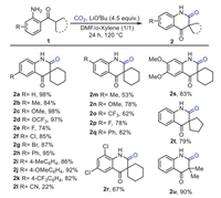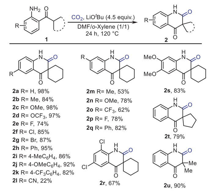 | Scheme 2. Substrate scope. 1 (0.2 mmol), CO2 (1 atm), LiOtBu (4.5 equiv., 0.9 mmol), DMF/o-Xylene (2 mL, v/v = 1/1), 120 ℃, 24 h. Isolated yields are shown. | |