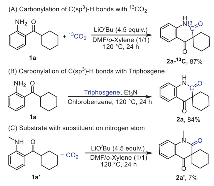 To elucidate the reaction mechanism, a series of experiments were conducted. Initially, the carbonylation reaction was performed using 13CO2 as the carbonyl source (Scheme 3A). The 13C NMR spectrum confirmed that CO2 is the primary carbonyl source in this reaction. Notably, when the reaction was conducted under an inert atmosphere, the target product was not obtained, further supporting this conclusion (Table 1, entry 18).