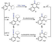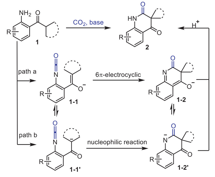 Based on the experimental results and relevant literature [24,31], we propose the following reaction mechanism: Initially, in the presence of CO2 and base, 1 is converted into the isocyanate intermediate 1–1 or 1–1′. A 6π-electrocyclization of 1–1 then affords the cyclized intermediate 1–2, which undergoes further rearrangement to yield the final product 2 (path a in Scheme 4). Given that 1–1 and 1–1′ can undergo keto-enol tautomerization, the enolate form 1–1′ may also participate in nucleophilic attack on the isocyanate group (–N=C=O), ultimately leading to the formation of the target product 2 (Path b in Scheme 4, Fig. S8 in Supporting information). At the current stage, the dominant reaction pathway cannot be unequivocally determined from experimental evidence. Alternatively, the available experimental data do not allow the exclusion of other routes to the final product involving an isocyanate intermediate.