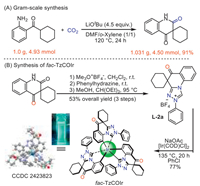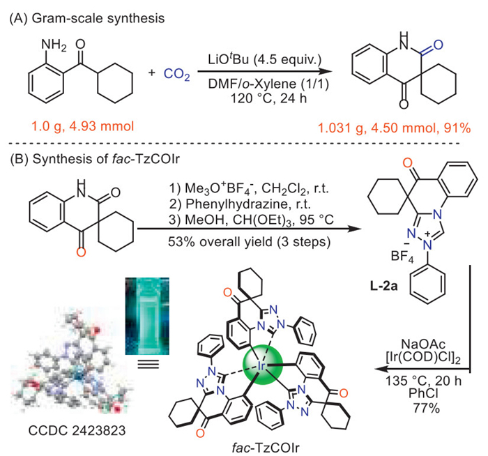 Following the establishment of the methodology, we demonstrated its utility in organic synthesis. First, we conducted a gram-scale reaction of 1a and obtained the target product 2a in 91% yield (Scheme 5A). As discussed earlier in the article, N-heterocyclic carbene (NHC) compounds play a significant role in the catalysis reaction and the development of luminescent materials [41,42]. 2,4-Quinolinedione with the spiral-ring structure possesses the unique dual carbonyl configuration and strong rigidity. By converting this compound into an NHC ligand and coordinating it with iridium, it could unlock surprising possibilities for luminescent OLED materials [43,44]. Accordingly, we successfully synthesized a carbonyl-containing NHC ligand with the triazole-spiral-ring (L-2a) from 2a, and obtained the associated Ir(Ⅲ) complex fac-TzCOIr. The structure of Ir(Ⅲ) complex was confirmed by single-crystal X-ray diffraction (Scheme 5B and Fig. S1 in supporting information).