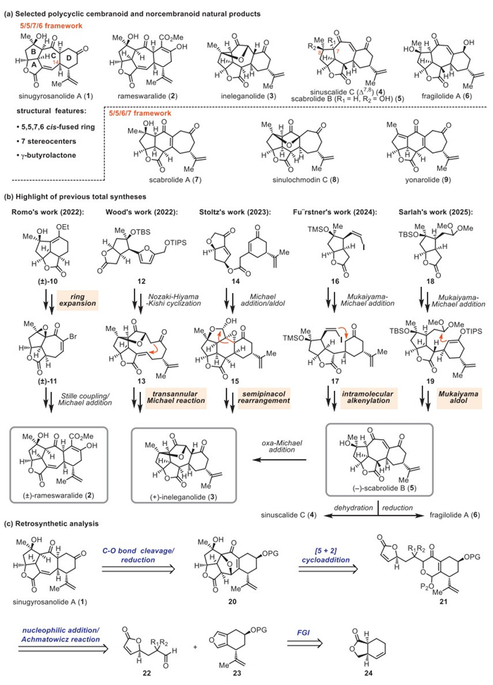 Owing to their challenging structures and potential bioactivities, polycyclic cembranoids and norcembranoids containing 5,5,7,6 core have drawn much attention from the synthetic community (Scheme 1b) [31–35]. In 2022, the Romo group [31] utilized a ring expansion to build the 5,5,7-tricycle core and assembled the key D ring via Stille coupling and intramolecular Michael addition, enabling the first racemic total synthesis of rameswaralide (2). Subsequently, the Wood group [32] completed the first total synthesis of ineleganolide (3), featuring a Nozaki−Hiyama−Kishi cyclization/transannular Michael reaction sequence. The Stoltz group [33] reported the total synthesis of 3 using a Michael addition/aldol cascade to rapidly establish pentacyclic framework and a unique semipinacol rearrangement to furnish the central seven-membered ring. In 2024, Fürstner and co-workers [34] disclosed a highly efficient intramolecular alkenylation to construct the central cycloheptene ring and completed the total synthesis of 3, sinuscalide C (4), scabrolide B (5), and horiolide. Very recently, the Sarlah group [35] achieved an elegant synthesis of 5 and realized its transformation to 3, 4, and 6 via sequential Mukaiyama−Michael/aldol reactions.