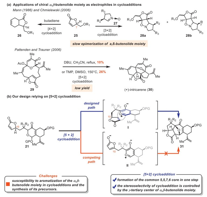 The α,β-butenolide moiety, due to the acidity at its γ-position, readily forms the corresponding enolate, enabling its use as a nucleophile in aldol, Mannich, and Mukaiyama-Michael reactions [5]. It also serves as an electrophile in Michael additions and cycloadditions [10–17,19]. In these processes, the chirality and functionality of the α,β-butenolide moiety are frequently exploited to control stereo- and regioselectivity. However, the susceptibility of the α,β-butenolide moiety to aromatization has limited its application in cycloadditions. Although the stereochemical integrity of the α,β-butenolide moiety was maintained in [2 + 2] and some [4 + 2] cycloadditions, these reactions usually occurred under neutral conditions [15–17]. The Chmielewski [11] and Mann groups [10] studied [3 + 2] and [4 + 2] cycloadditions, respectively, involving α,β-butenolide moiety 25 as electrophiles, wherein slow epimerization of α,β-butenolide moiety was observed (Scheme 2a). The Pattenden [12,14] and Trauner [13] groups subsequently disclosed a biomimetic total synthesis of intricarene via [5 + 2] cycloaddition reaction between an oxidopyrylium ylide and α,β-butenolide moiety. However, the significantly low yield (10%−26%) compromised the synthetic efficiency. In our designed strategy, compound 21 could be converted to the oxidopyrylium ylide intermediate Ⅰ (Scheme 2b). Owing to the chirality at C10, the oxidopyrylium ylide was expected to approach the α,β-butenolide moiety from its β face and undergo an intramolecular [5 + 2] cycloaddition to deliver 31. This single-step transformation would rapidly construct the 5,5,7,6-tetracyclic framework. However, conventional [5 + 2] cycloadditions are generally carried out under harsh conditions, such as high temperature and base. Consequently, a key challenge is to suppress aromatization of the α,β-butenolide moiety to prevent formation of the dienol intermediate Ⅱ. Additionally, synthesizing the cycloaddition precursor 21 bearing the fragile α,β-butenolide itself presents another significant obstacle. In brief, employing the α,β-butenolide moiety as an electrophile in cycloadditions within structurally complex systems (e.g., 21) remains challenging.