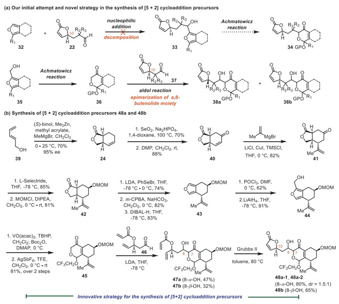 With ample quantities of 44 in hand, we then focused on the synthesis of the cycloaddition precursor. An Achmatowicz reaction of 44 with VO(acac)2/TBHP, followed by Boc-protection of the anomeric hydroxyl group in the same pot, furnished the desired ring expansion product. However, this intermediate failed to undergo coupling with aldehyde 46 (see Supporting information for preparation of 46). In 2019, the Li group reported the use of a trifluoroethoxyl group as a leaving group in a [5 + 2] cycloaddition [56]. Inspired by this work, the intermediate underwent trifluoroethoxylation to afford 45 as a single diastereomer in 81% yield over two steps. Fortunately, aldol reaction of compound 45 and aldehyde 46 led to 47a (8-α-OH; a pair of inseparable diastereomers, dr = 1.5:1 at C7) and 47b (8-β-OH; a pair of inseparable diastereomers, dr = 1.6:1 at C7). Subsequent RCM reaction [69] furnished three separable diastereomers (48a-1, 48a-2 and 48b) as cycloaddition precursors on a multigram scale. Critically, no epimerization at C10 was observed. Moreover, for intramolecular oxidopyrylium-mediated [5 + 2] cycloadditions, literature precedents typically employ furan as the tethering fragment prior to an Achmatowicz reaction to access cycloaddition precursors. To the best of our knowledge, this work represents the first example: coupling of a dihydropyranone acetal and another fragment to access [5 + 2] cycloaddition precursor. This strategy offers an alternative approach for preparing structurally complex [5 + 2] cycloaddition precursors bearing sensitive functional groups.