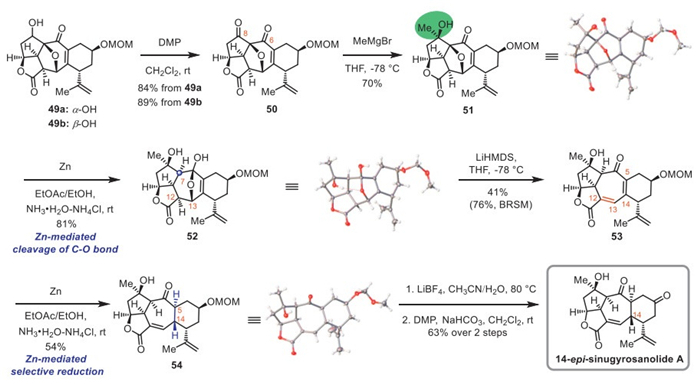 With compound 53 in hand, the next step required the regio- and stereoselective reduction of the tetrasubstituted Δ5,14 olefin. Initial attempts (e.g., NaBH4/NiCl2, NaSeH and NaHTe) failed to afford the desired regioselectivities (Table S3 in Supporting information). Hydrogenation also proved ineffective. We therefore turned our attention to single-electron reduction conditions. Fortunately, the reduction of tetrasubstituted Δ5,14 olefin was accomplished using zinc under basic conditions, affording compound 54 as a single diastereomer in 54% yield [72]. The structure of 54 was confirmed by single crystal X-ray diffraction. Unfortunately, the stereochemistry at C14 was opposite to that of natural sinugyrosanolide A. Subsequent efforts to invert this C14 stereogenic center by controlling temperature or altering solvents proved unsuccessful. Additionally, similar results were observed by using SmI2-mediated reactions [70,71]. Reversible radical epimerization strategies (e.g., BIN3 and TBADT/(4-ClPhS)2) [74,75] led only to complex reaction mixtures without discernible product. Moving forward, a mild Lewis acid LiBF4 was used to cleave the MOM protective group of 54 [76], followed by oxidation with DMP, which completed the asymmetric total synthesis of (–)-14-epi-sinugyrosanolide A, a stereoisomer of the natural product 1, in a 63% yield over two steps.