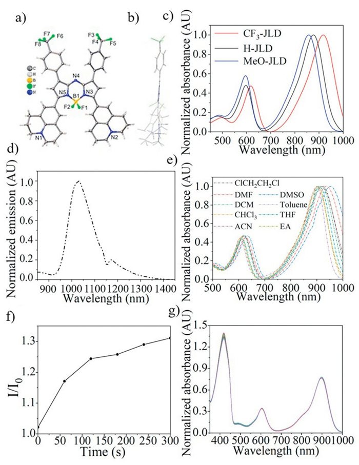 | Fig. 1. (a) Oak Ridge thermal ellipsoid plot (ORTEP) views of CF3-JLD (CCDC: 2380901). (b) Side views of the molecular structure. Selected angles (°): N5-B1-F1, 111.3(2); N3-B1-F2, 110.9(2); F1-B1-F2, 110.8(2); N3-B1-N5, 107.39(19). (c) Normalized absorption spectra of aza-BODIPY with p-trifluoromethyl phenyl, phenyl and p-methoxyphenyl group at 1,7-sites in CH2Cl2. (d) Normalized emission spectrum of CF3-JLD in CH2Cl2. λex = 808 nm; the slit is 5 nm. (e) Absorption spectra of CF3-JLD in solvents. (f) ROS generation of CF3-JLD (5 µmol/L) in THF under continuous 808 nm laser (0.3 W/cm2) irradiation for 5 min using DCFH (10 µmol/L) as an indicator. (g) 1O2 generation efficiency of CF3-JLD with time when DPBF is the indicator. | |