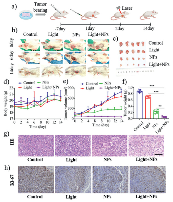 Inspiring by the excellent phototherapy effect of Light+CF3-JLD NPs, we further explore the in vivo antitumor effect of CF3-JLD NPs in 4T1 breast tumor-bearing mice (Fig. 4a). All of the animal experiment procedures herein were permitted by the Animal Ethics Committee of Sciences of Shenyang Pharmaceutical University. The tumor-bearing mice were randomly divided into four groups: control, light, CF3-JLD NPs and light+CF3-JLD NPs. The initial tumor volumes of four groups were all about 100 mm3. After treatment of 6–14 days, the tumor of light+CF3-JLD NPs group was minimal, compared to other groups as shown in Fig. 4b. Moreover, the control and light groups had no inhibitory effect on tumor growth for 14 days and the tumor inhibition effect of CF3-JLD NPs group was limited. As shown in Figs. 4c–f, the volumes of tumor increased rapidly for control, light and CF3-JLD NPs group, suggesting that single laser irradiation and CF3-JLD NPs alone both had no suppression capacity on tumor growth. In contrast, the tumor volumes of light+CF3-JLD NPs group were obvious inhibition for 14 days and the final dissected tumor was in small size and weight (56.37 mm3, 45.2 mg). Additionally, no distinct weight loss of the body in different groups was observed, indicating the stable biosafety of CF3-JLD NPs. As expected, the light+CF3-JLD NPs group exhibited significantly enhanced tumor growth inhibitory rate than single CF3-JLD NPs or light groups, which attributed to NIR-triggering phototherapy effect of CF3-JLD NPs for better antitumor efficiency. Simultaneously, hematoxylin-eosin staining (HE) and immunohistochemistry of Ki-67 images further confirmed the large injury area of tumor tissues and limited proliferated ability of light+ CF3-JLD NPs group. In detailed, it was observed that the cellular morphology of tumor was destroyed (Fig. 4g) for light+CF3-JLD NPs group and the proliferation-related protein was decreased obviously (Fig. 4h). Meanwhile, it was no obvious pathological changes appeared in HE staining of major organs (heart, liver, spleen and kidney), demonstrating that the superior biocompatibility of CF3-JLD NPs (Fig. S11 in Supporting information).
