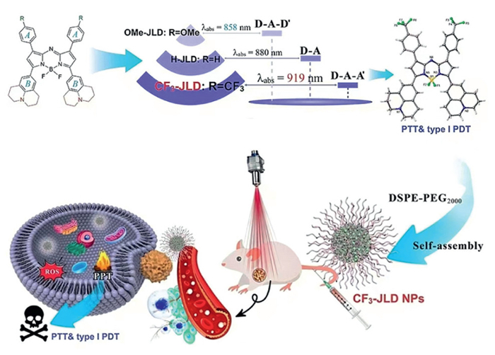 Utilizing 9-acetyljulolidine generated by Friedel-Crafts acylation, target compound aza-BODIPY CF3-JLD was smoothly prepared by 15.5% total yield. The structure of CF3-JLD was undoubtedly confirmed by a single crystal X-ray analysis, and the boron atom in the center is a slightly distorted sp3 configuration. Compared with tetraphenyl aza-BODIPY (λabs = 640 nm in CH2Cl2), a dramatically bathochromic shift of 279 nm was observed in CF3-JLD (λabs = 919 nm). The maximum absorption of OMe-JLD in the D-A-D’ system was found to hypochromatically shift to be 858 nm in CH2Cl2, while the maximum absorption of CF3-JLD bearing the D-A-A’ system bathochromically shifted be 919 nm yet, comparing to that of the parent dye H-JLD (λabs = 880 nm). HOMO and HOMO-1 are mostly distributed on the aza-BODIPY core and the phenyl ring B, while the LUMO are mainly located on the BODIPY core and the phenyl ring A, thus these two states are of partial charge-transfer character, indicating that reduction of the energy gap HOMO-LUMO prefers D-A-A’ system in aza-BODIPYs. Based on the ROS generation, superoxide radical (O2•−) was generated and this is a PS of type Ⅰ PDT. When irradiating the solution of self-assembled nanoparticles (CF3-JLD NPs) for 5 min, the temperature rapidly increased from 23.4 ℃ to 88.7 ℃, with temperature difference of 65.3 ℃. The photothermal conversion efficiency of CF3-JLD NPs was very high and calculated to be 81%. CF3-JLD NPs can effectively induce 4T1 cell death in vitro, and the cellular morphology of tumor was destroyed and the proliferation-related protein was decreased in vivo under NIR irradiation by phototherapy. The findings of this study suggest that our work offers a robust design strategy of the D-A-A’ system for the development of aza-BODIPY phototherapy agents in the NIR-Ⅱ region.