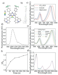 And, CF3-JLD has high molar extinction coefficients (ε = 187,000 L mol−1 cm−1) and broad full width at half maximum (FWHM = 123 nm) in CH2Cl2, comparing to that (116 nm) of H-JLD or OMe-JLD (Table S2), just indicating that non-radiative transitions lead to more energy loss during the de-excitation process of CF3-JLD. Indeed, the rotational barrier for the –CF3 group of CF3-JLD is about 0.12 kcal/mol (Fig. S2 in Supporting information), indicating that the rotation of –CF3 group in solution is very easy. This causes more system energy (such as heat) to be released through the non-radiative way. Additionally, the maximum emission of CF3-JLD is 1029 nm in CH2Cl2 within NIR-Ⅱ region (Fig. 1d), even reaching 1069 nm in DMSO (Fig. S3 in Supporting information), but its fluorescence quantum yield is so low to be 0.01. Furthermore, the solvent effect of CF3-JLD is also investigated (Fig. 1e). It was found that when the solvent changed from toluene to DMSO, the maxima absorption is from 898 nm to 952 nm respectively, due to the effect of solvent polarity. Meanwhile, we explored the effect of CF3-JLD on the aggregation mode, and the absorption spectra variation of CF3-JLD in the mixed solution of tetrahydrofuran (THF) and H2O was recorded (Fig. S4 in Supporting information). It was found that when the mixture ratio of THF and H2O was 1:1, the maxima absorption redshifted to 936 nm, and the corresponding absorption maximum in THF solution was 908 nm (Fig. 1e).