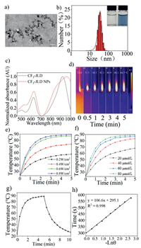 | Fig. 2. (a) Morphology of CF3-JLD NPs under transmission electron microscopy. Scale bar: 100 nm. (b) Size distribution of CF3-JLD NPs in aqueous solution. Inner panel for the photo of pure water (left) and CF3-JLD NPs in water (right). (c) Absorption of CF3-JLD (black curve) in CH2Cl2 and CF3-JLD NPs (red curve) in aqueous solution. (d) Photos of the photothermal effect (23.4–88.7 ℃). (e) Photothermal effect of CF3-JLD NPs under different power conditions. (f) Photothermal effect of CF3-JLD NPs under different concentration conditions. (g) Temperature changes in the heating–cooling phase. (h) Cooling time versus the negative natural logarithm of driving force temperature. | |