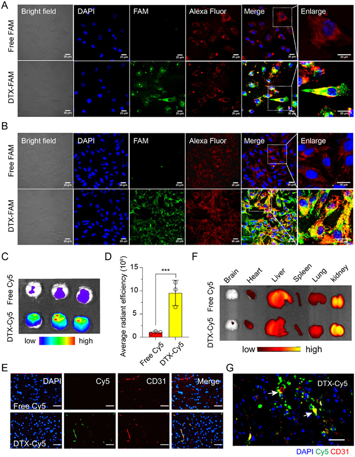 | Fig. 2. Dual-targeting ability of DTX to the BBB and glioma. Confocal microscopy images of cellular uptake of DTX in hBMEC (A) and U87 cells (B). Blue represents the cell nuclei stained with 4′,6-diamidino-2-phenylindole (DAPI), green denotes DTX-FAM or free FAM, red signifies DTR labeled with a fluorescent secondary antibody, and yellow indicates the overlapping color resulting from the colocalization of DTX with DTR. Scale bar: 20 µm. Ex vivo fluorescence images (C) and semi-quantitative analysis (D) of brain tissues from normal BALB/c mice 30 min post-injection of free Cy5 and DTX-Cy5 (n = 3). (E) Fluorescence images of the brain slices after administration of free Cy5 and DTX-Cy5. (F) Ex vivo fluorescence images of the main organs from glioma-bearing BALB/c nude mice 1 h post-injection of free Cy5 and DTX-Cy5 (n = 3). (G) Fluorescence image of the glioma slices from glioma-bearing BALB/c nude mice 1 h post-injection of DTX-Cy5. In Figs. 2E and G, blue represents the cell nuclei stained with DAPI, green denotes DTX-Cy5 or free Cy5, red signifies blood vessels labeled with CD31 antibody, and yellow indicates the overlapping color resulting from red with green. The white arrow indicated DTX-Cy5 leaking out of the brain vessels. Scale bar: 50 µm. Data are means ± SD. ***P < 0.001. | |