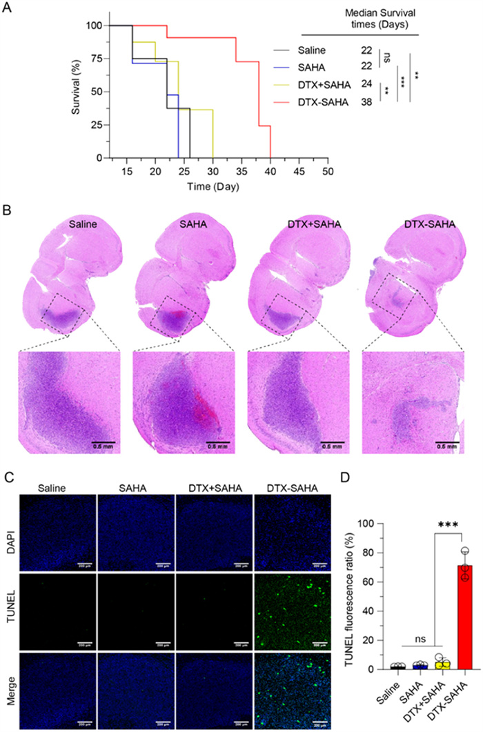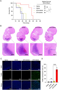 The survival curves of the BALB/c nude mice bearing intracranial U87 xenograft treated with saline, SAHA, DTX+SAHA and DTX-SAHA were presented in Fig. 4A. DTX-SAHA was able to effectively extend the median survival time of the model mice to 38 days, significantly outperforming the other groups. Representative whole-brain hematoxylin-eosin (H&E) staining images, as depicted in Fig. 4B, demonstrated that DTX-SAHA effectively suppressed glioma growth, exhibiting the smallest tumor lesions among all the treatment groups. Immunohistochemical staining analysis was conducted on the glioma tissues of the mice post-treatment as shown in Figs. 4C and D. The DTX-SAHA group exhibited the highest fluorescence intensity in terminal deoxynucleotidyl transferase-mediated dUTP-biotin nick end labeling (TUNEL) staining, indicating the most substantial level of tumor apoptosis. Overall, the results highlight the potent ability of DTX to potentiate the anti-glioma effect of SAHA.