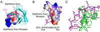 | Fig. 1. Binding mode of DTX and diphtheria toxin receptor. (A) The diphtheria toxin receptor and diphtheria toxin. (B) DTX and diphtheria toxin receptor. Diphtheria toxin receptor was represented by electrostatic potential surface. The active peptides were shown in sticks and colored in purple. (C) The interaction details between DTX (purple) and diphtheria toxin receptor (green). The interacting residues were represented in sticks and the hydrogen bonds were shown by dash lines. | |