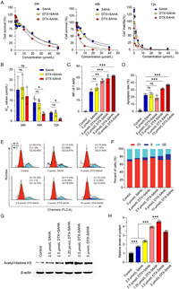 | Fig. 3. Cytotoxicity of DTX-SAHA against U87 cells. (A) Cell viability after treatments with different concentrations of SAHA, DTX+SAHA and DTX-SAHA for 24, 48, and 72 h, respectively. (B) IC50 values calculating from the viability curves. (C) Cell viability stained with 7-AAD after treatments with SAHA, DTX+SAHA or DTX-SAHA for 24 h. (D) Cell apoptosis after treatments with SAHA, DTX+SAHA or DTX-SAHA for 24 h. (E, F) Cell cycle and statistical analysis of the percentage of cells in different arrest phases after treatments with SAHA, DTX+SAHA or DTX-SAHA for 24 h. Western blot assay (G) and semi-quantitative analysis (H) of the expression of acetly-histone H3 in U87 cells. Data are means ± SD (n = 3). ns: no significant difference. *P < 0.05, **P < 0.01, ***P < 0.001. | |