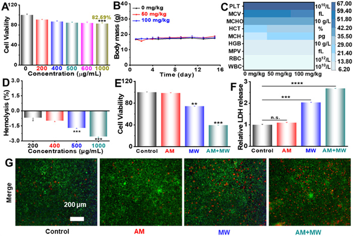 | Fig. 2. Biosafety and cell inhibition of AM NIAs. (A) Viability of 4T1 cells under incubation with different mass concentrations of AM NIAs (n = 5). (B, C) Changes in body weight and routine blood tests of mice in each group after injection of different mass concentrations of AM NIAs (n = 3). (D) Hemolytic test results of AM NIAs (n = 3). (E) Viability of 4T1 cells under different treatments (n = 5). (F) Relative amount of LDH released by different treatment (n = 5). (G) Fluorescence images of 4T1 cells in different treatment groups co-stained with calcein-AM and PI. Data are presented as mean ± SD. **P < 0.01, ***P < 0.001, ****P < 0.0001. | |