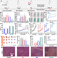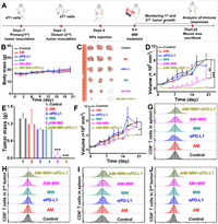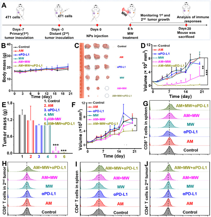 | Fig. 5. Sensitization of MW-αPD-L1 immunotherapy via AM NIAs. (A) Schematic diagram of treatment for bilateral tumor model. (B) Body weight change curves in mice within 20 days after different treatment. (C–F) The tumor tissues, tumor volume curves, tumor mass of primary tumors, and tumor volume curves of distant tumors in different group. (G–J) Flow cytometry results of CD8+ T cells and CD4+ T cells in spleen and distant tumors of each group. Data are presented as mean ± SD (n = 3). *P < 0.05, **P < 0.01, ***P < 0.001. | |