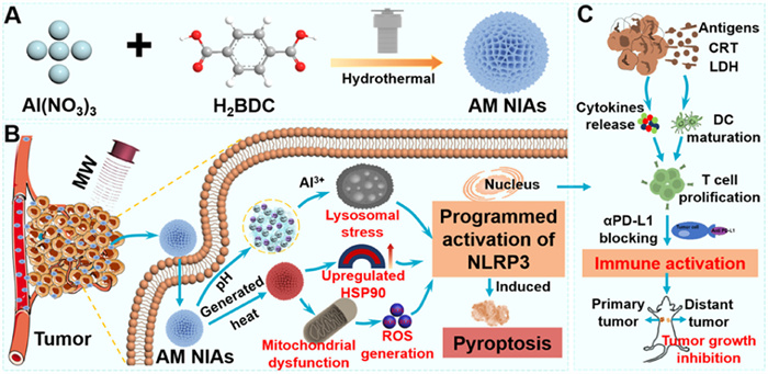 | Scheme 1. Schematic representation of the synthesis of MW-sensitive AM NIAs and its enhancement of MW-ICB through programmed activation of NLRP3-mediated pyroptosis. (A) The synthesis of AM NIAs. (B) Mechanism of programmed activation of NLRP3-mediated cell pyroptosis by AM NIAs combined with MW. (C) Mechanism of AM NIAs-triggered pyroptosis combined with αPD-L1 strategy to elicit a potent antitumor immune response that effectively suppresses primary and distant tumors. | |