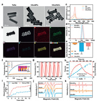 HAuHbO2 is prepared by binding sulfhydryl groups on HAuNPs and Hb to form disulfide bonds. The stability of HAuNPs and the biological activity of Hb were both well preserved, which was confirmed by the following experiments. First, transmission electron microscopy (TEM) was used to demonstrate the morphological features of the nanozyme. The rod-like morphology of TeSe, HAuNPs and HAuHbO2 can be visualized clearly in Fig. 1a. The hollow structure of HAuNPs increases the surface area of the material, making it an effective carrier. A thin film can be visualized on the surface of HAuHbO2 demonstrating the successful loading Hb onto the HAuNPs. Additionally, elemental mapping further analyzes the composition of HAuHbO2 at Fig. 1b. The characteristic absorption peaks of Hb, HAuNPs, and HAuHbO2 were measured by ultraviolet-visible (UV–vis) spectrophotometer (Fig. 1c). HAuHbO2 was found to have characteristic peaks of Hb and HAuNPs, indicating the successful construction of the nanozyme. The hydrodynamic sizes of HAuNPs and HAuHbO2 are shown in Fig. 1d, which are 125 and 170 nm, respectively. It indicates that the particle size is increasing from HAuNPs to HAuHbO2. In addition, it was determined in Fig. 1e that the zeta potentials of Hb, HAuNPs, and HAuHbO2 were −1.06, −5.96, and −2.48 mV, respectively. These experimental results confirmed the successful preparation of the nanozyme and revealed the potential functions, including PTT and photoacoustic (PA) imaging.