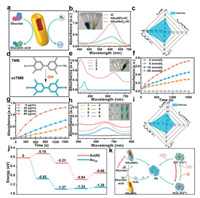 | Fig. 2. Validation of the enzyme activities of HAuHbO2. (a) Mechanism of H2O2 production by HAuNPs. (b) The generation of H2O2 was verified by IC. (c) GOD-like kinetic calculations for HAuHbO2. (d) TMB to detect the reaction mechanism of •OH generation. (e) UV absorption spectra of TMB incubated under PBS (1), TMB+Glu (2), TMB+HAuHbO2 (3), and TMB+Glu+HAuHbO2 (4). (f) Effect of different glucose concentrations on the production of •OH. (g) Effect of different concentrations of HAuHbO2 on the generation of •OH. (h) Assay of the ability to generate •OH under PBS (1), PBS+NIR (2), HAuNPs (3), HAuNPs+NIR (4), HAuHb (5), HAuHb+NIR (6), HAuHbO2 (7), HAuHbO2+NIR (8). (i) POD-like kinetic calculations for HAuHbO2. (j) Free energy diagram of HAuHbO2 in the process of glucose dehydrogenation to H2O2. (k) Mechanistic diagram of spontaneous cascade catalysis for HAuHbO2. | |