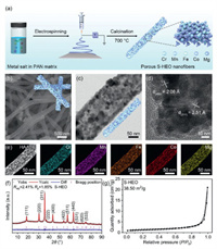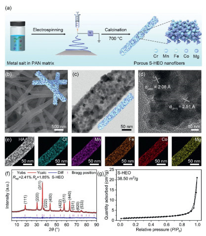 | Fig. 1. (a) Schematic illustration for electrospinning S-HEO nanofibers. (b) SEM, (c) TEM, (d) HRTEM, and (e) HAADF−STEM and elemental mapping images of S-HEO nanofibers. The scale bars in (e) are 50 nm. (f) XRD patterns of HEO nanofibers. Rietveld refinement shows data points (red circle), the calculated intensity (black line), the positions of reflection peaks (pink vertical bar), and the difference profile (blue line). (g) N2 adsorption/desorption isotherms of the HEO nanofibers. | |