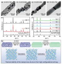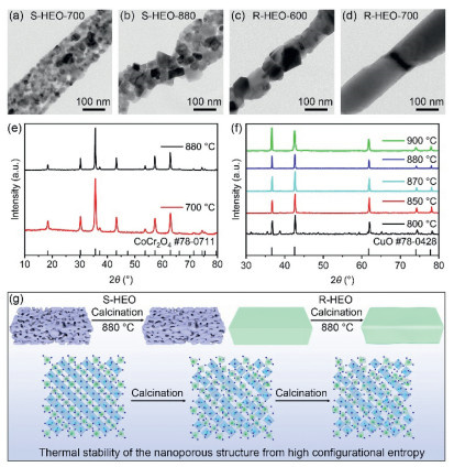 | Fig. 2. (a, b) TEM images of S-HEO nanofibers at elevated temperatures. (c, d) TEM images of R-HEO nanofibers at elevated temperatures. (e) XRD patterns of S-HEO nanofibers at elevated temperatures. (f) XRD patterns of R-HEO nanofibers at elevated temperatures. (g) Schematic illustration for the thermal stabilization mechanism of pore structures of S-HEO nanofibers. | |