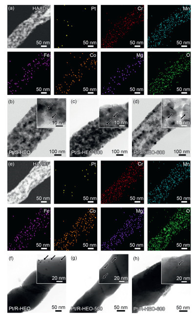 | Fig. 3. (a) HAADF−STEM image and corresponding elemental mappings of Pt/S-HEO. The scale bars are 50 nm. TEM images of (b) Pt/S-HEO, (c) Pt/S-HEO-500, (d) Pt/S-HEO-600. (e) HAADF−STEM image and corresponding elemental mappings of Pt/S-HEO-500. The scale bars are 20 nm. TEM images of (f) Pt/R-HEO, (g) Pt/R-HEO-500, and (h) Pt/R-HEO-600. | |