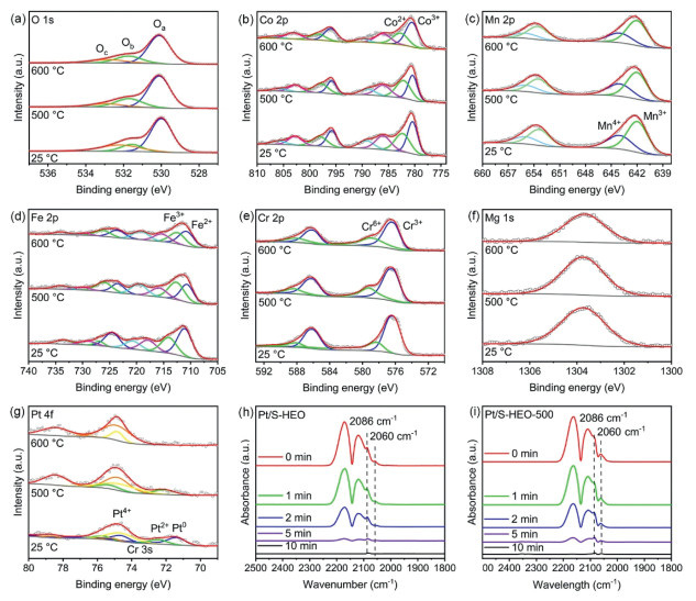 | Fig. 4. XPS spectra of (a) O 1s, (b) Co 2p, (c) Mn 2p, (d) Fe 2p, (e) Cr 2p, (f) Mg 1s, (g) Pt 4f of Pt/S-HEO at elevated temperatures. In situ DRIFTS spectra of the CO desorption for (h) Pt/S-HEO and (i) Pt/S-HEO-500. | |