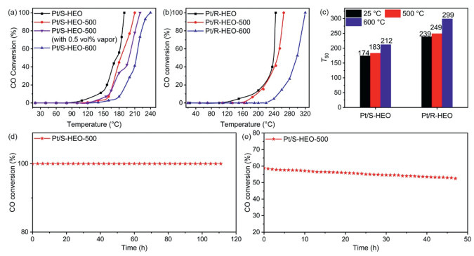 | Fig. 5. CO oxidation performance of (a) Pt/S-HEO and (b) Pt/R-HEO at elevated temperatures. (c) T50 of Pt/S-HEO and Pt/R-HEO at elevated temperatures. (d, e) The stability of Pt/S-HEO-500. | |