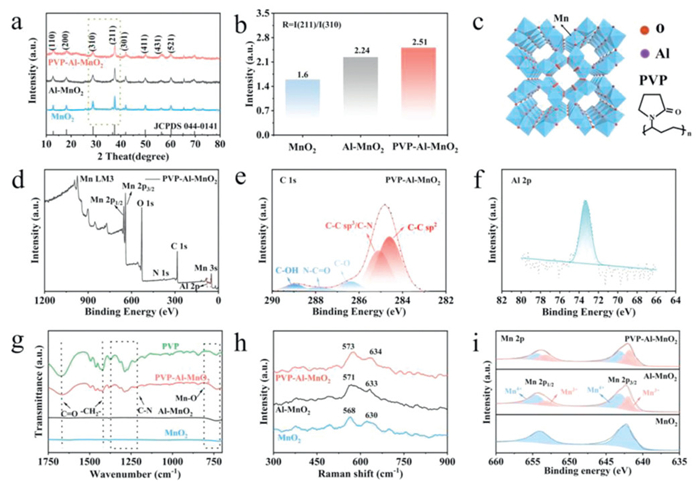| Fig. 1. Structural characterizations of PVP-Al-MnO2. (a) XRD patterns of pristine α-MnO2, Al-MnO2 and PVP-Al-MnO2. (b) The intensity ratios of (211)/(310) peaks for three samples. (c) The crystal framework of α-MnO2 with Al ions and PVP intercalation. (d) XPS survey spectra. (e) C 1s XPS result of PVP-Al-MnO2. (f) Al 2p XPS result of PVP-Al-MnO2. (g) FTIR spectra of PVP, PVP-Al-MnO2, Al-MnO2 and MnO2. (h) Raman spectra. (i) Mn 2p XPS spectra of three samples. | |