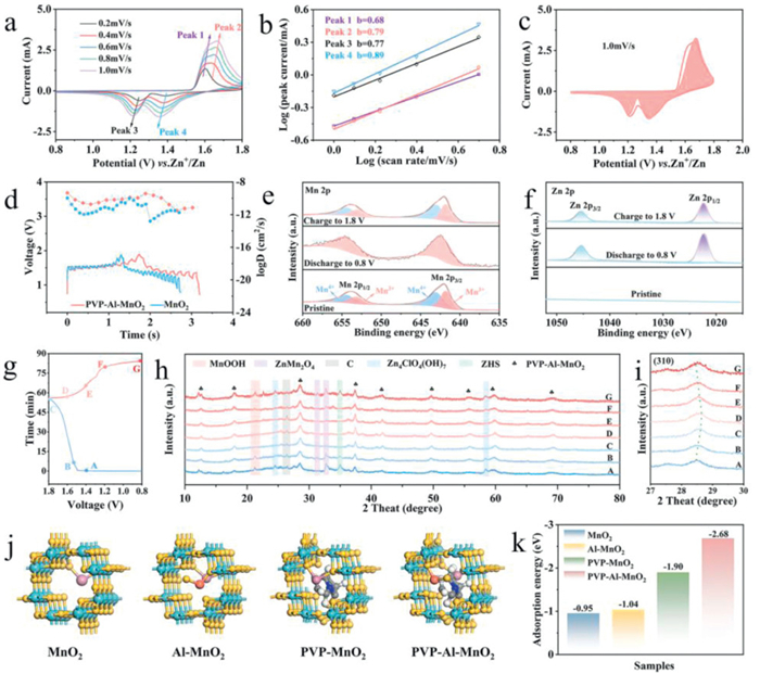 | Fig. 4. Charge/discharge mechanism of PVP-Al-MnO2. (a) CV profiles of PVP-Al-MnO2 cathode. (b) The b value according to logv and logi plots. (c) CV curve with the capacitive-like portion. (d) GITT distributions and the corresponding ion diffusion coefficients of PVP-Al-MnO2 cathode. XPS spectra of (e) Mn 2p and (f) Zn 2p. (g-i) Ex-situ XRD patterns. (j, k) Theoretical simulations, structural models and relative adsorption energy (Eads) of Zn-ions absorbed. | |