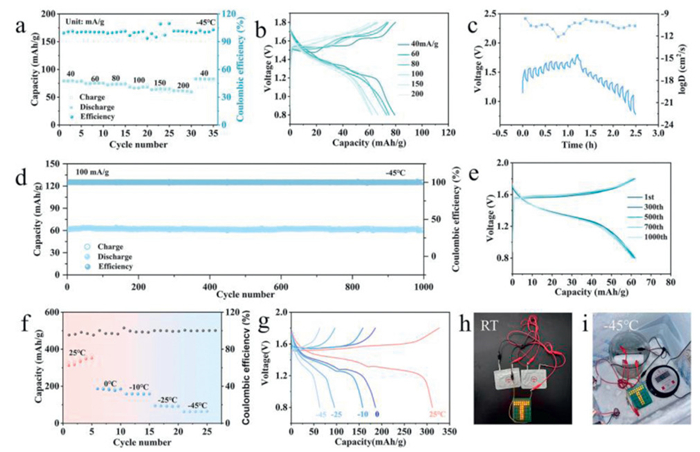 | Fig. 5. Low-temperature electrochemical behaviors of PVP-Al-MnO2. (a) Rate capacities and (b) the charge-discharge curves. (c) GITT curves and ion diffusion coefficients of PVP-Al-MnO2 cathode. (d) Cycling behaviors at 100 mA/g and (e) the charge-discharge curves. (f) Electrochemical performances at various temperatures and (g) the corresponding charge-discharge profiles. The LED lights powered (h) at room temperature and (i) -45 ℃. | |