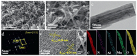The morphological information of all the samples was collected using SEM and TEM. PVP-Al-MnO2, Al-MnO2 and bare MnO2 all exhibits nanofibre morphologies (Figs. 2a–c and Fig. S2 in Supporting information). SAED was performed in order to obtain the structural information on PVP-Al-MnO2, and the result is shown in Fig. 2d. The spots can be well indexed to the typical reflections of tunnel structure along the [113] zone. The lattice spacings of 0.24 nm and 0.32 nm can be seen in HRTEM (Fig. 2e) image, which matches well to the (211) and (310) planes of tetragonal a-MnO2 phase. The elemental mapping images (Fig. 2f) present a uniform distribution of C, N, Al, Mn and O elements, confirming the formation of PVP-Al-MnO2 material.