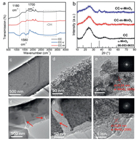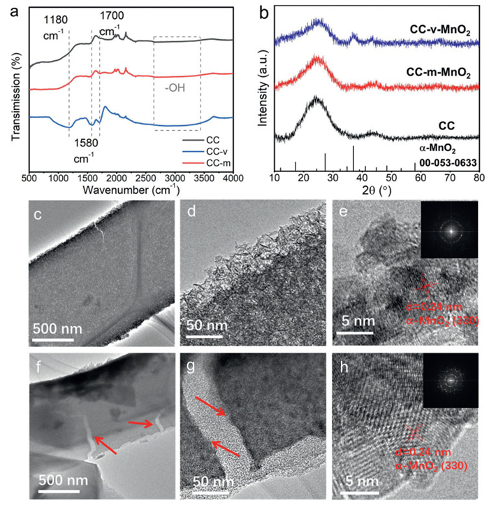 | Fig. 1. The structural characterization of CC, CC-v-MnO2, and CC-m-MnO2 samples. (a) FTIR spectra of the pristine CC and two treated CC substrates. (b) XRD patterns of CC, CC-v-MnO2, and CC-m-MnO2. TEM images of (c-e) CC-v-MnO2 and (f-h) CC-m-MnO2 at different magnifications. The insets in (e) and (h) correspond to the SAED patterns. | |