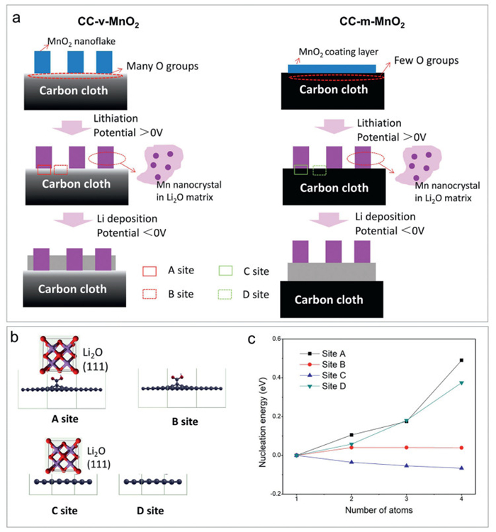 | Fig. 3. (a) Schematic illustration of lithiation of and lithium deposition in the CC-v-MnO2 and CC-m-MnO2 hosts. (b, c) DFT calculation of the Li nucleation energies at different sites. | |