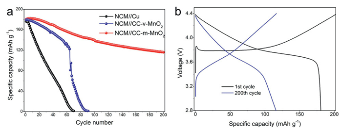 | Fig. 4. (a) Cycling performances of NCM//Cu, NCM//CC-v-MnO2, and NCM//CC-m-MnO2 based AFLMB at 0.5 C. (b) Charge/discharge curves of the NCM//CC-m-MnO2 anode-free cell at the 1st and 200th cycle. | |