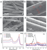 | Fig. 2. SEM images of the CC-m-MnO2/Li composite (a, b) at a lithium plating capacity of 10 mAh/cm2 and (c, d) after full lithium stripping. Depth profiles of XPS measurement of (e) Mn 2p and (f) B 1s spectra in the CC-m-MnO2/Li composite. | |