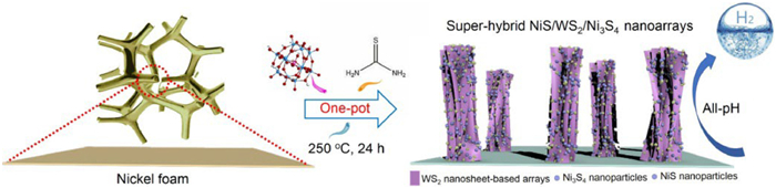 With these points in mind, we elaborately manipulate the sequential hydrolysis of W and Ni sources to construct super-hybrid metal sulfide nanoarray comprising P doped WS2 nanosheets, NiS and Ni3S4 nanoparticles. The super-hybrid nanosheet arrays exhibited abundant plane- and edge-type WS2nullNiS and WS2nullNi3S4 heterointerfaces, which were proved to be robust for electrocatalytic HER under all-pH electrolytes. The density functional theory (DFT) result indicated that WS2-plane-related heterointerfaces could be more active for water dissociation and hydrogen adsorption, thus leading to the activity promotion. Moreover, the open super-hybrid nanosheet array and the P doping enable the unobstructed active heterointerfaces and facilitate the electron transfer as well as the mass transport during HER. This study presents an effective strategy for arming TMS-based materials in electrocatalysis application.