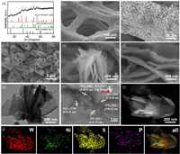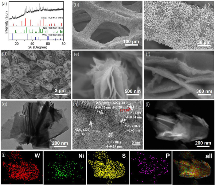 | Fig. 2. (a) XRD pattern. (b-f) SEM images taken at different magnifications and from different perspective. (g) Low- and (h) high-magnification TEM images. (i) STEM image. (j) EDX elemental mapping of Super-NiS/WS2/Ni3S4. | |