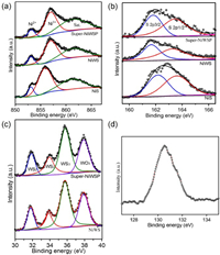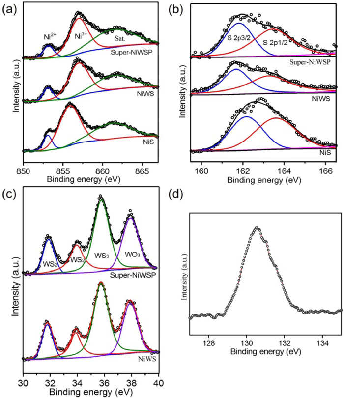| Fig. 3. Elemental XPS spectra of (a) Ni 2p and (b) S 2p in Super-NiWSP, NiWS, and NiS. (c) W 4f in Super-NiWSP and NiWS. (d) P 2p in Super-NiWSP. | |