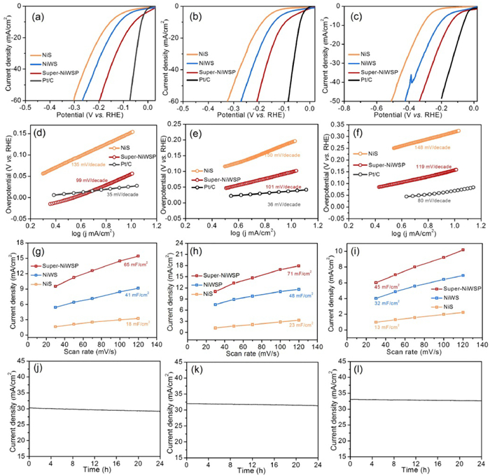 | Fig. 4. HER performance tests of Pt/C, super-NiWSP, NiWS, and NiS samples. The first/second/third/fourth row corresponds to the plots of polarization, Tafel, ECSA, and stability, respectively. The first/second/third column means the test electrolytes of 1 mol/L KOH (a, d, g, and j), 0.5 mol/L H2SO4 (b, e, h and k), and 1 mol/L PBS (c, f, i, and l). | |