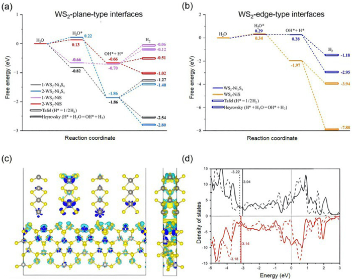 | Fig. 5. The pathways of HER based on free energy calculations on (a) WS2-plane-related and (b) WS2-edge-related WS2—NiS and WS2—Ni3S4 heterointerfaces. (c) Calculated electron density difference plot at WS2 (up)-plane-NiS (down) heterointerface (side views from different direction). (d) Calculated partial density of states of S in NiS before (broken line) and after (solid line) making heterointerface (red/black color means down/up-spin). | |