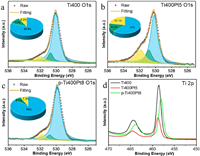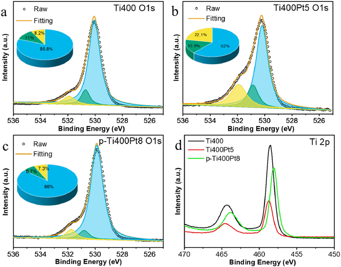 | Fig. 3. The O 1s XPS spectra for amorphous (a) Ti400, (b) Ti400Pt5 and (c) p-Ti400Pt8, respectively. (d) The Ti 2p for different samples. | |