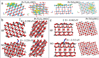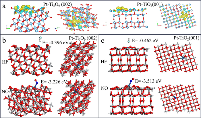 | Fig. 4. (a) The Electronic structure for the samples with and without photo-assistant after ALD Pt, respectively (gray, red, and blue balls denote Ti, O, and Pt atoms, respectively. The yellow color means obtaining electrons and the light blue means losing electrons). (b, c) The absorbed atomic structure for HF and NO on Pt-Ti5O9 (002) and p-Ti400Pt8 with TiO2(001) surface. | |
