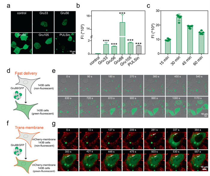 | Fig. 1. Gru88 efficiently deliver GFP into 143B cells through a rapid process. Confocal images (a) and FI (b) of 143B cells incubated with Grus/GFP complexes for 0.5 h. (c) Protein delivery efficacy of Gru88 at different incubation times. (d) Schematic illustration of rapid delivery of GFP by Gru88 into 143B cells. (e) Time-slice images of 143B cells incubated with the Gru88/GFP complex. (f) Schematic illustration of transmembrane delivery of GFP by Gru88 into mCherry-membrane-143B cells. (g) Time-slice images of mCherry-membrane-143B cells incubated with the Gru88/GFP complex. The doses of Gru88 and GFP were 25 and 40 µg/mL, respectively. Data are shown as mean ± standard deviation (s.d.) (n = 3). | |