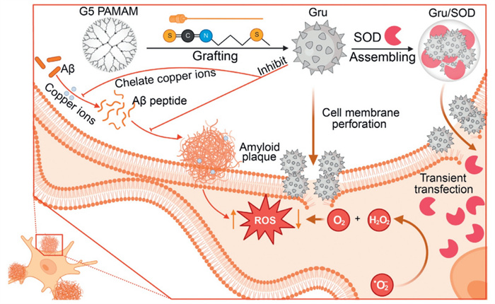 In summary, we have successfully engineered a multifunctional protein delivery system by incorporating erucin onto cationic polymers. The representative polymer Gru88 can rapidly transport target proteins into cells via a membrane perforation mechanism. This rapid delivery approach effectively preserves the activity of the target proteins. The incorporation of erucin introduces a substantial number of thiourea and thioether groups into the polymer carrier. These groups endow the material with exceptional copper ion binding capabilities, which can be harnessed to ameliorate the pathological environment associated with copper homeostasis imbalance. Gru88 is highly effective in inhibiting the fibrillar aggregation of Aβ peptides, whether mediated by copper ions or independent of them. Moreover, by delivering the antioxidant enzyme SOD, Gru88 effectively suppresses the intracellular ROS levels induced by the fibrillar aggregation of Aβ peptides. Consequently, it reduces the apoptosis rate, demonstrating its potential in mitigating the detrimental effects associated with Aβ peptide aggregation. For future in vivo studies, we propose functionalizing the nanoparticles with blood-brain barrier-targeting ligands, such as transferrin receptor antibodies or angiopep-2 peptides, which exploit receptor-mediated transcytosis.