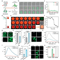 | Fig. 2. Gru88 enables intracellular protein delivery through direct membrane perforation. (a) Schematic illustration and (b) time-slice images of 143B cells incubated with the RBITC-Gru88/GFP complex. (c) Statistical analysis of red and green fluorescence intensities along a line at different time points. (d) Schematic illustration of the experimental protocol for GUVs. (e) Confocal images and (f) mean FI of sulforhodamine B-encapsulated GUVs (RB-GUVs). RB-GUVs were incubated with Gru88/GFP complexes and imaged every minute. (g) Confocal images and FI analysis (h-i) of 143B cells treated with calcein AM (h) or calcein (i) after 0.5 h of Gru88 incubation. (j) Confocal images of 143B cells incubated with the Gru88/GFP or Gsfn86/GFP complexes for 0.5 h. FI of the Gru88 (k) or Gsfn86 (l) complexes with GFP in deionized water and NaCl (110 mmol/L) solutions, respectively. (m) Protein release ratio in NaCl (110 mmol/L) solutions determined by k and l. Confocal images (n) and FI (o) of 143B cells incubated with RBITC-Gru88/GFP and RBITC-Gsfn86/GFP complexes for 0.5 h. The polymer and protein concentrations were 25 and 40 µg/mL, respectively. Data are shown as mean ± s.d. (n = 3). **P < 0.01, ***P < 0.001. | |